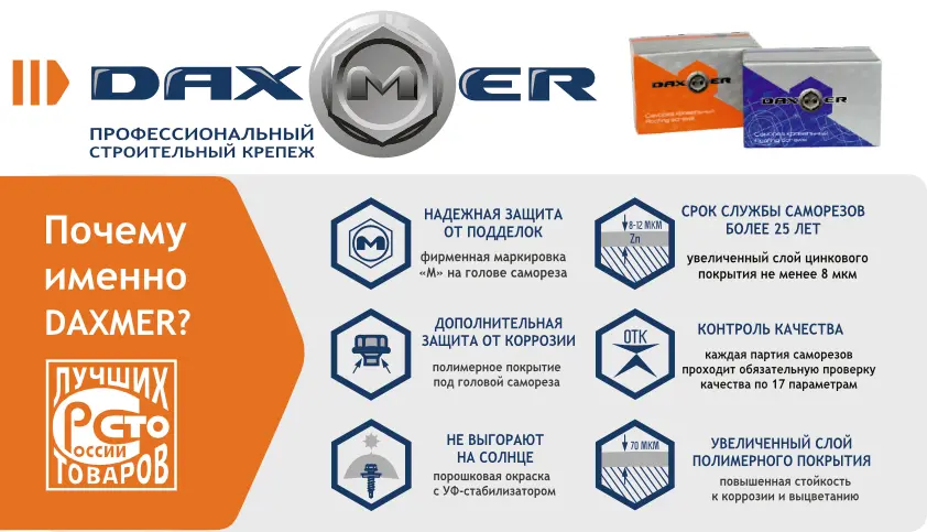 С 2008 года компания «Руфкомплект» вывела на рынок широкий ассортимент профессионального строительного крепежа премиум-класса собственной торговой марки «Daxmer».