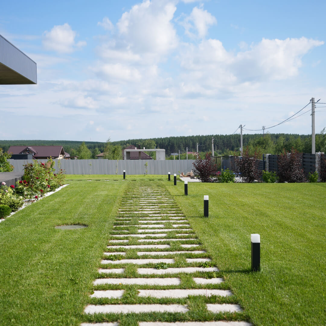 Большой и удобный формат изделий позволяет осуществить монтаж просто, легко и быстро. Пошаговые плиты обычно располагают на расстоянии 60-80см между центрами. После укладки промежутки заполняют гравием, мелким щебнем или мраморной крошкой.