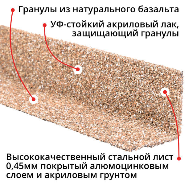| Внешнее покрытие | Крупнозернистая посыпка гранулами из натурального базальта |