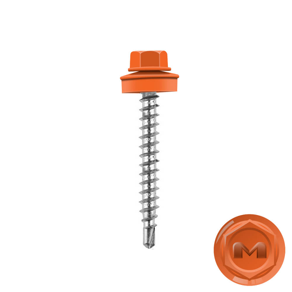 Кровельные саморезы Daxmer (Даксмер) по дереву цветом RAL2010 Оранжевый 4,8*35мм окрашиваются УФ-стойкой полиэфирной порошковой краской. Цинковое антикоррозийное покрытие обеспечивает длительный срок службы саморезов (не менее 25 лет). Специальная металлическая шайба с ЕРDМ - уплотнителем обеспечивает плотное прилегание профилированного металла (кровли) к деревянной обрешетке, а также препятствует попаданию влаги.